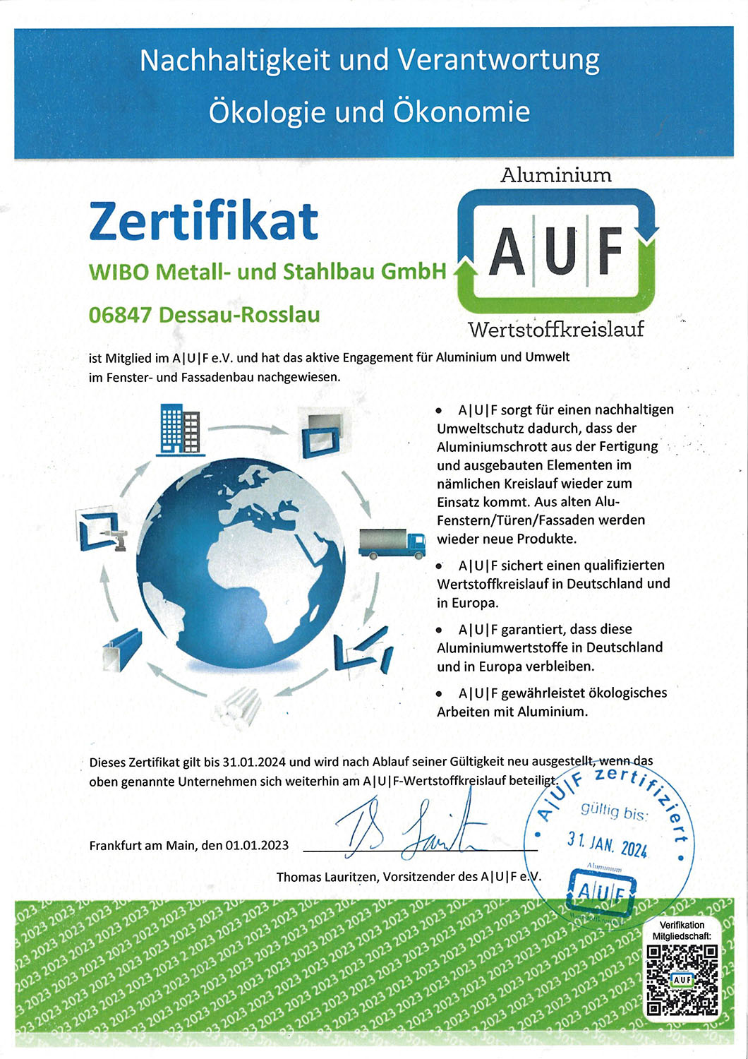 Aluminium ist zu 100% recyclebar. Für geeignete Rücknahme- und Aufbereitungsprozesse gibt es Initiativen wie A|U|F. Der Verein sorgt dafür, dass ein geschlossener Recycling-Kreislauf innerhalb Europas von demontierten alten Elementen bis hin zu neuen Profilen und damit auch letztendlich der Einbau neuer Fenster, Türen und Fassaden sichergestellt wird. WIBO ist Mitglied im A|U|F e.V. und hat das aktive Engagement für Aluminium und Umwelt im Fenster – und Fassadenbau nachgewiesen.